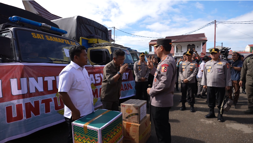 Sebagai bentuk kehadiran negara, Kapolri juga menyerahkan secara simbolik delapan truk bantuan ‘Polri untuk Masyarakat’ yang berisi bahan makanan, pakaian dan kebutuhan sehari-hari kepada Bupati Tapanuli Tengah, Masinton Pasaribu. Bantuan tersebut langsung didistribusikan ke posko pengungsian warga terdampak banjir di GOR Pandan, Tapanuli Tengah.